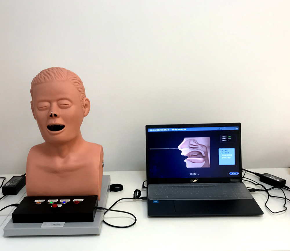 呼吸道分泌物采集训练仿真系统,针对鼻咽和口咽拭子分泌物的采集训练而设计,系统分为硬件及软件部分,在鼻咽及口咽相关位置设置传感器,通过真实的鼻拭子或咽拭子在呼吸道分泌物采集模型上进行训练,按照采集的标准流程,可以对操作过程中的路径、位置等信息进行采集,并反应到PC端的模型上,形象化的展示拭子在采集过程中所处的解剖位置以及采集的部位是否正确,手感真实,可用于培训及考核。