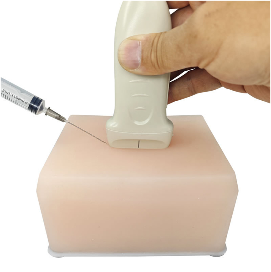 内部设有肿瘤、血管、神经和囊肿4种不同穿刺模型,其中4个肿瘤大小8~12mm不等,埋设深度4~7cm;3条血管直径3~5mm,埋设深度2~4cm;1条神经直径2mm,埋设深度1.5cm;2个囊肿直径15~20mm,埋设深度4~7cm。另外配套模拟血液流动系统,可模拟血液的循环。