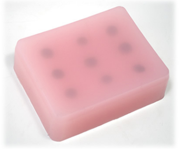 内部含9个模拟肿块,肿块大小5~20mm大小不等,深度于皮肤下方15~35mm区域内,可以在超声下显示高回声,边界清。模型为肉色非透明状态。